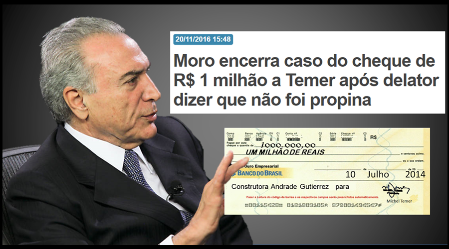 Dilma mostrou que cheque foi para Temer, empreiteiro mudou versãoUm cheque no valor de 1 milhão de reais pago pela construtora Andrade Gutierrez em nome de Michel Temer (PMDB) durante a campanha de 2014 colocou o presidente mais uma vez no raio da Operação Lava Jato, mas não por muito tempo.Isso porque o ex-presidente da Andrade Gutierrez Otávio Marques de Azevedo retificou o depoimento dado em setembro à Justiça Eleitoral e afirmou em novo depoimento, que não houve pagamento de propina. A doação, disse à época, seria fruto de pressão e parte de um acordo para que a construtora repassasse 1% de propina de cada contrato com o governo federal.